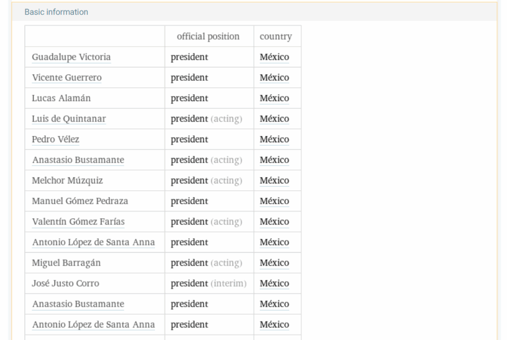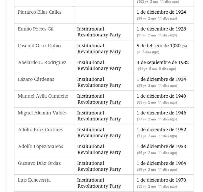 Otra tabla con el partido y la fecha de inicio del mandato.