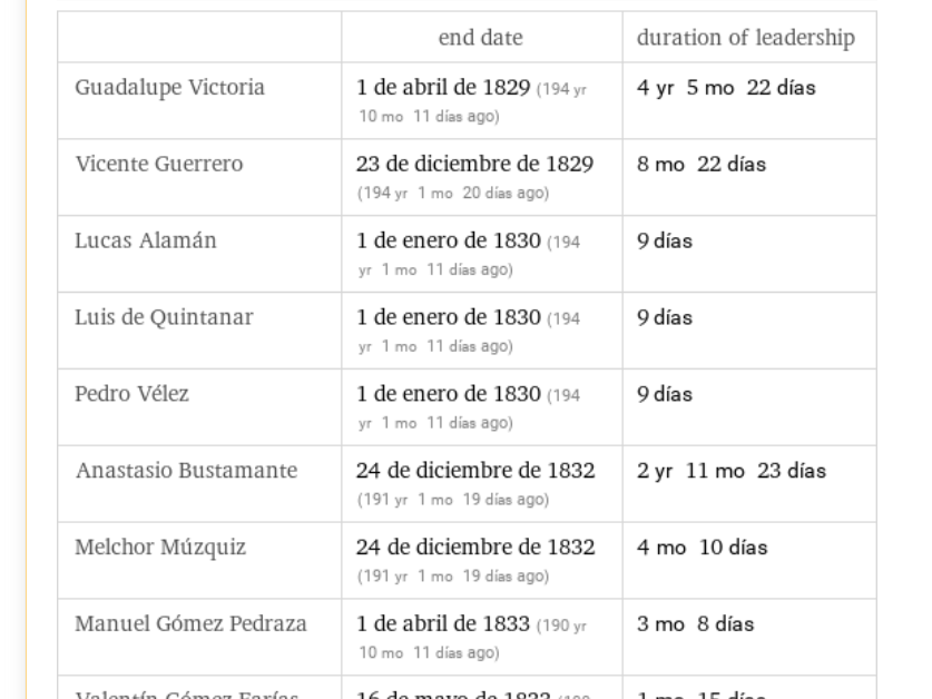 Tabla con su fecha de término de mandato y la duración del mismo.