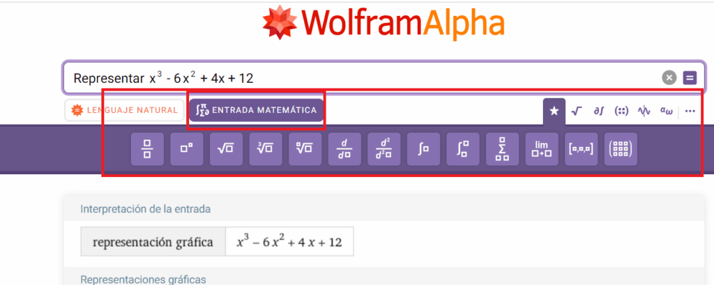 Otra forma para representar ecuaciones o funciones, es hacer uso de la “Entrada matemática” al seleccionarlo despliega un menú donde podemos hacer uso de los diferentes caracteres para representar desde integrales, matrices y funciones trigonométricas.