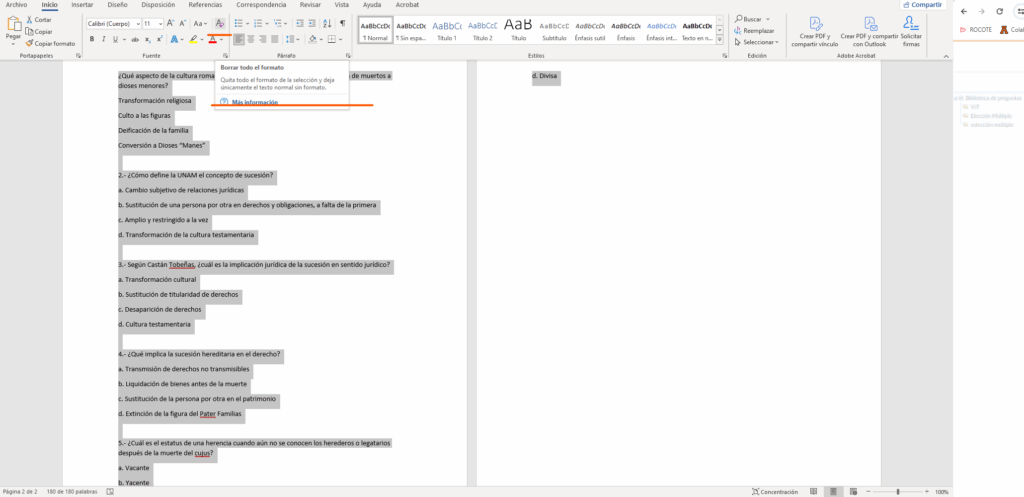 Paso 1: Las preguntas deben ser redactadas en una hoja de Word. Es necesario borrar el formato de las preguntas, como vemos en la siguiente imagen encontraremos borrar formato en la esquina superior izquierda