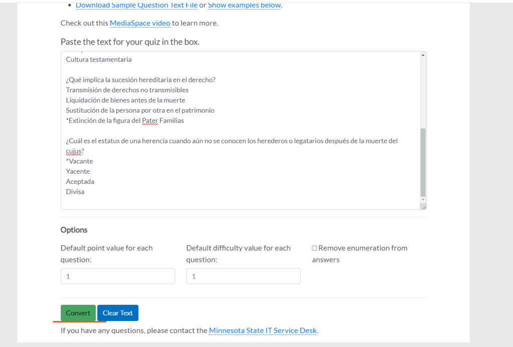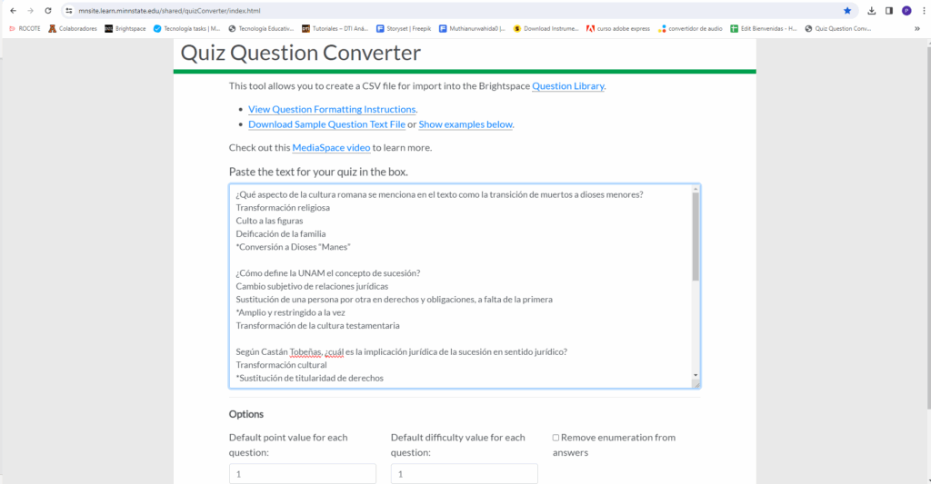 https://mnsite.learn.minnstate.edu/shared/quizConverter/index.html ingresar en el siguiente link. Una vez ingresado es necesario copiar y pegar todas las preguntas que se desean cargar.