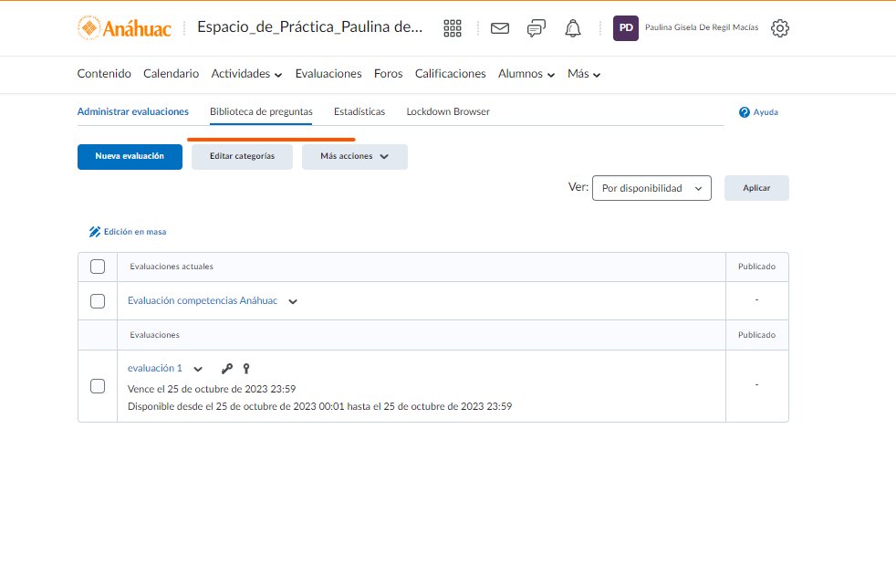 Paso 7: A continuación nos dirigiremos a nuestro curso en brightspace, evaluaciones > biblioteca de preguntas