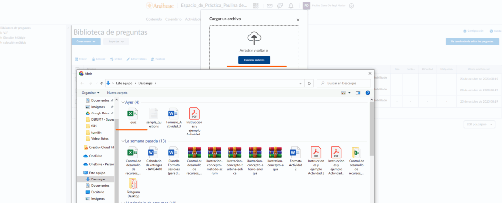 Paso 8:Una vez ahí seleccionaremos cargar archivo y seleccionaremos nuestro archivo Excel llamado “quiz”