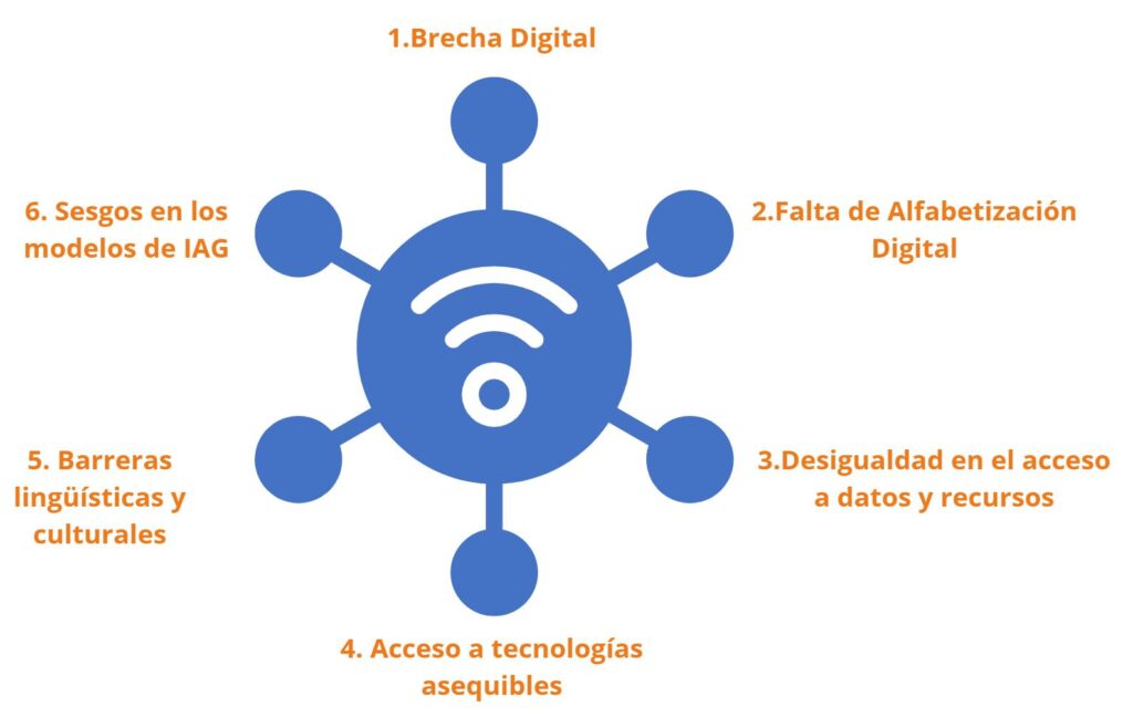 Uno de los mayores desafíos para asegurar el acceso equitativo a la IAG es la persistente brecha digital. Esta brecha se manifiesta en la falta de infraestructura tecnológica, como la conectividad a internet de alta velocidad, computadoras adecuadas o dispositivos móviles en muchas comunidades. Sin estas herramientas básicas, es imposible acceder a las plataformas de IAG que están disponibles en línea. Además, muchas áreas rurales y comunidades en desarrollo enfrentan limitaciones significativas en términos de acceso a una infraestructura tecnológica moderna.