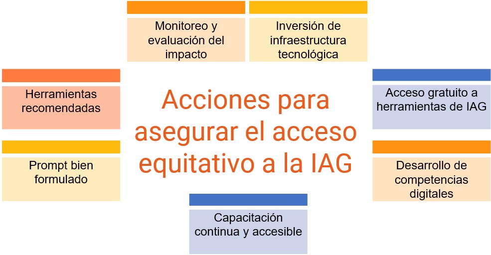Asegurar el acceso equitativo a las tecnologías de Inteligencia Artificial Generativa es un reto crucial en la sociedad actual. Si no se abordan las barreras tecnológicas y educativas, las desigualdades en el acceso a estas herramientas seguirán ampliándose, con consecuencias negativas para las personas y las instituciones más vulnerables. Implementar políticas que fomenten la inversión en infraestructura, el acceso gratuito a herramientas tecnológicas, y la capacitación continua es esencial para garantizar que la IAG beneficie a todos. Solo a través de un enfoque inclusivo y colaborativo se puede garantizar que estas tecnologías sean un recurso al servicio de la equidad y el progreso social.
