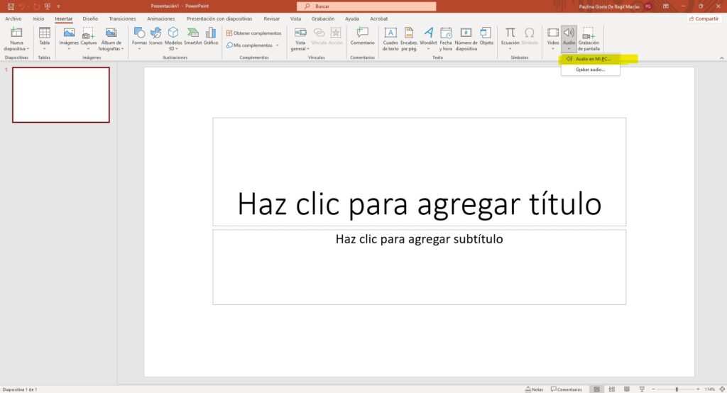 1. Seleccionar Insertar en la diapositiva correspondiente, y luego Audio.
