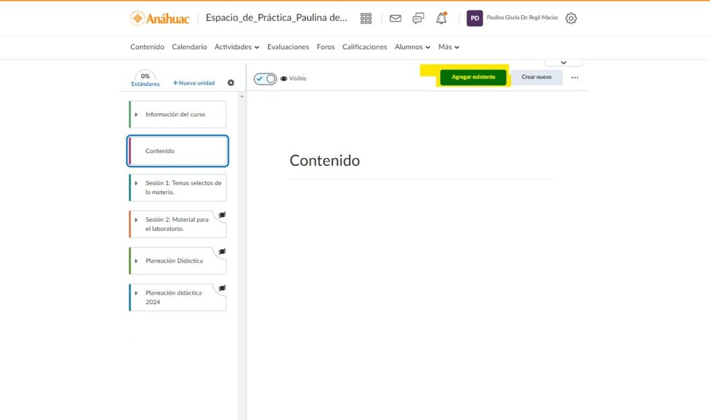 2. Dirigirse al contenido y seleccionar tu unidad y pulsar el boton crear existente