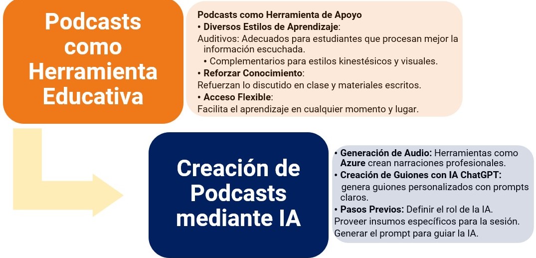 La creación de podcasts educativos es accesible gracias al uso de herramientas de inteligencia artificial (IA), que facilitan el proceso. Una de las aplicaciones más útiles en este ámbito es el uso de generadores de audio como Azure u otras plataformas similares, que transforman guiones en narraciones claras y profesionales. Estas herramientas generan voces artificiales que simulan la naturalidad y fluidez del habla humana, haciendo que los podcasts sean comprensibles y atractivos.
