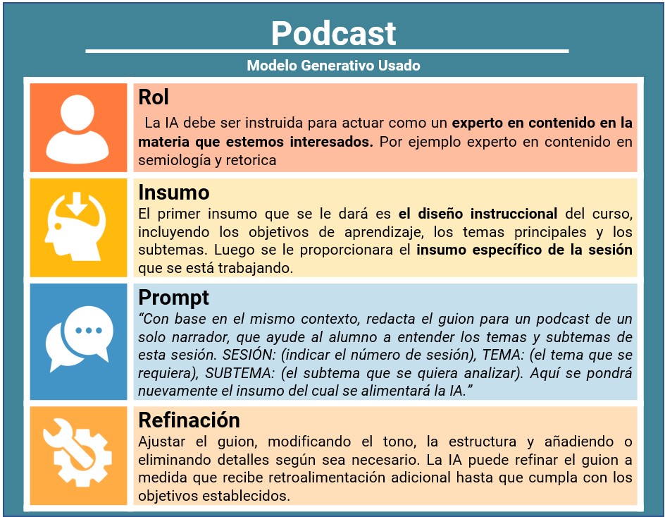 El contenido de estos podcasts puede ser generado a través de IA conversacional, como ChatGPT u otros modelos de lenguaje avanzados. Para guiar a la IA en la creación del guion, es necesario proporcionarle un prompt detallado y seguir ciertos pasos previos para preparar el contexto.