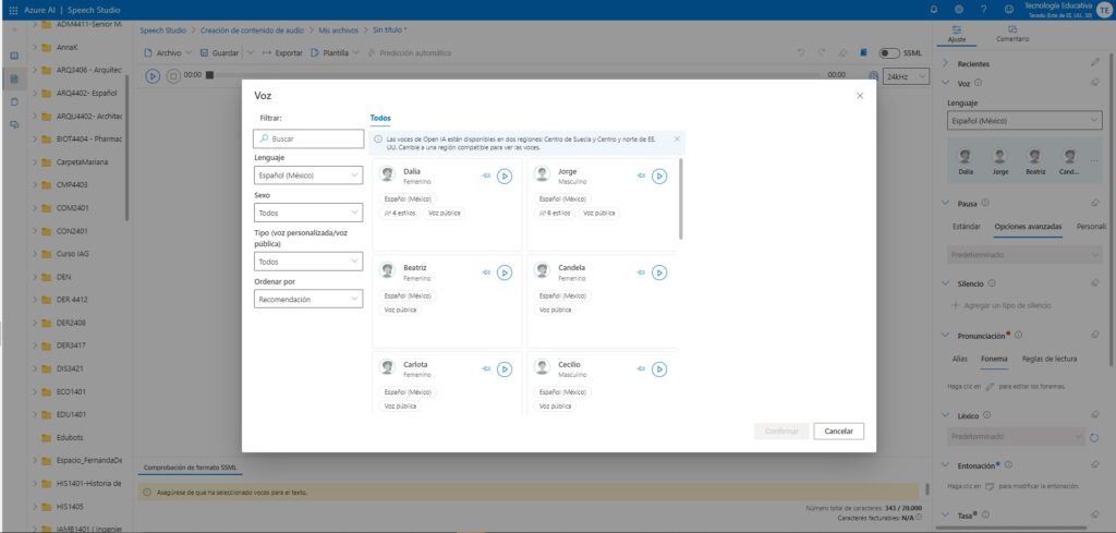 También es común que algunas palabras específicas sean malinterpretadas por la IA. Un ejemplo clásico es la palabra “podcast”, que podría ser pronunciada como “padcast”. Para resolver este tipo de errores, Azure te permite personalizar la pronunciación de ciertas palabras utilizando Speech Synthesis Markup Language (SSML). Esto te da el control sobre cómo deseas que la IA pronuncie términos más técnicos o extranjerismos.