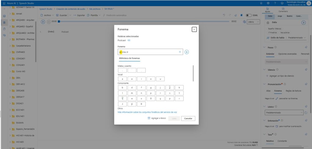Indicarle a Azure que la palabra “podcast” debe pronunciarse separando claramente las sílabas “pod” y “cast” puede marcar una gran diferencia. Al ajustar estos detalles, lograrás que el audio sea más preciso y suene más natural.
