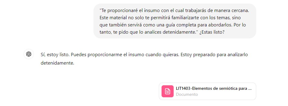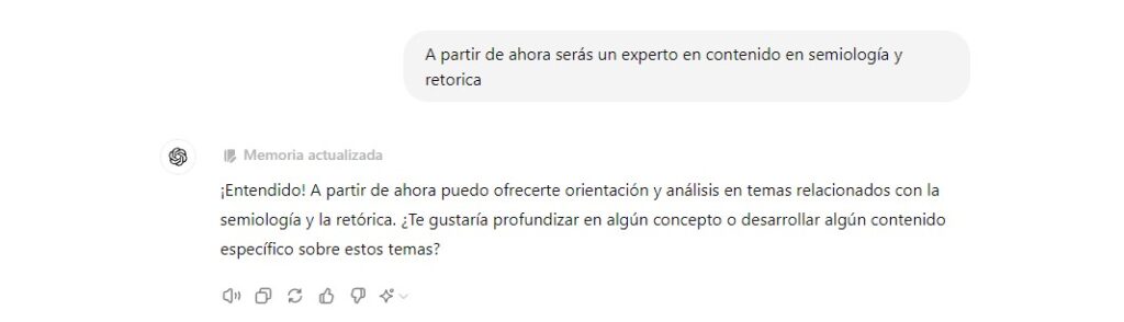 Antes de introducir el prompt, se debe definir el rol que asumirá la IA para generar el guion. Si el tema de la sesión es semiología y retórica, por ejemplo, la IA debe ser instruida para actuar como un experto en contenido de semiología y retórica, lo que asegura que las respuestas sean pertinentes y alineadas con el tema.