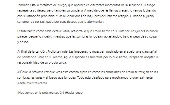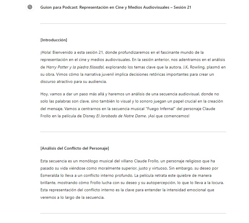 Una vez que la IA comprende el contexto general del curso, se le debe proporcionar el insumo específico de la sesión que se está trabajando. Por ejemplo, si se va a analizar la secuencia “Fuego Infernal” de El Jorobado de Notre Dame, se deben proporcionar detalles sobre la psicología del personaje Claude Frollo, los elementos líricos de la canción y los recursos visuales de la escena. En algunos casos, puede ser necesario repetir este paso para reforzar la instrucción.