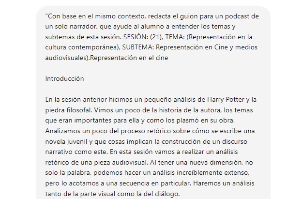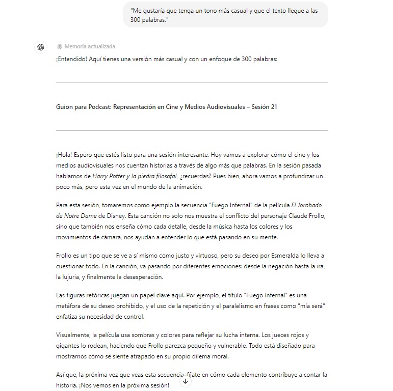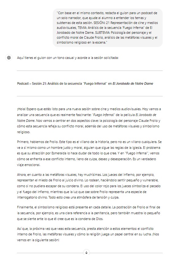 “Con base en el mismo contexto, redacta el guion para un podcast de un solo narrador, que ayude al alumno a entender los temas y subtemas de esta sesión. SESIÓN: (indicar el número de sesión), TEMA: (el tema que se requiera), SUBTEMA: (el subtema que se quiera analizar). Aquí se pondrá nuevamente el insumo del cual se alimentará la IA, que en este caso sería: ‘Análisis de la secuencia Fuego Infernal de El Jorobado de Notre Dame.'”