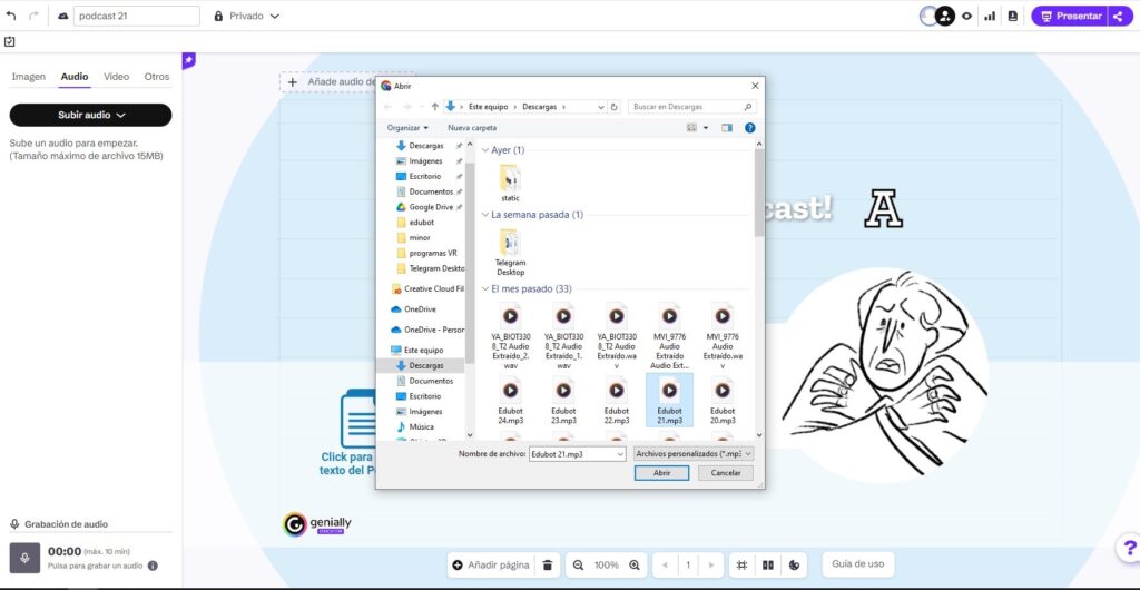El último paso consiste en incrustar el archivo de audio en una presentación interactiva para que los estudiantes puedan acceder a él. Las plataformas recomendadas son Genially y PowerPoint.