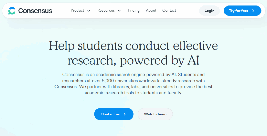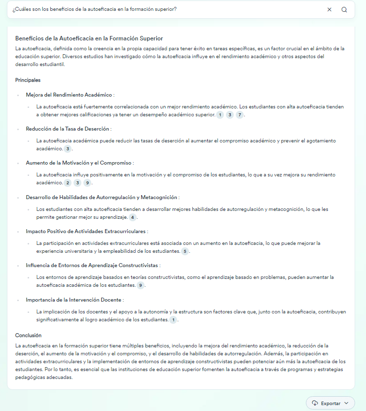 Consensus es un motor de búsqueda académico impulsado por inteligencia artificial generativa (IAG), que se basa en investigaciones científicas, ha sido creada para encontrar los artículos más relevantes de una base de datos con más de 200 millones de documentos científicos. Consensus sintetiza tanto a nivel de tema como de artículo, conectando siempre con publicaciones científicas reales.