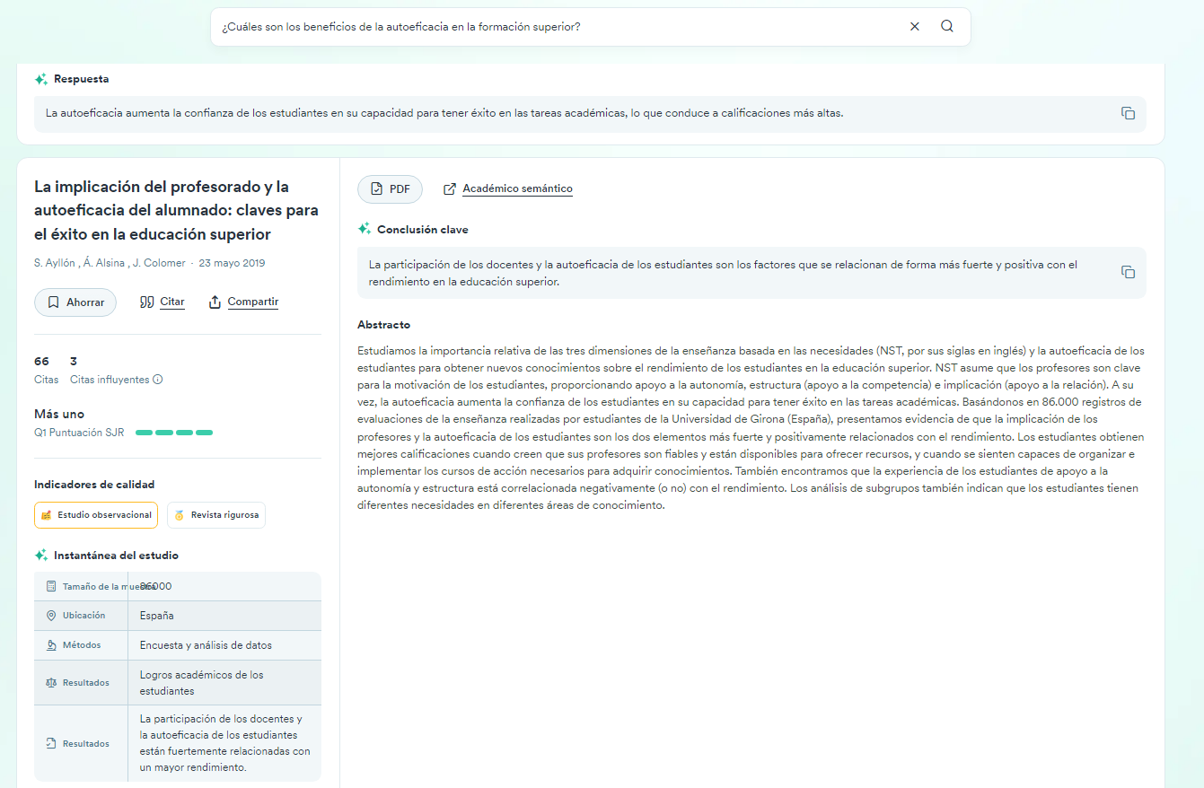 Al realizar la búsqueda, Consensus te mostrará: