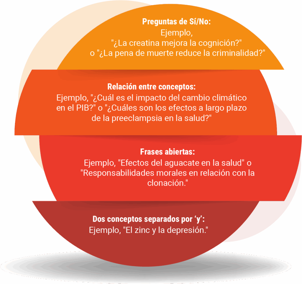 Es importante entender que Consensus es un motor de búsqueda académico, no un chatbot, por lo que estructurar tu consulta correctamente te ayudará a obtener mejores resultados. A continuación, algunos consejos para realizar búsquedas eficientes: