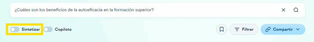 En la misma búsqueda, puedes activar la opción Synthesize, que te proporcionará una visión general sobre el tema y te ayudará a comprender el consenso o las opiniones predominantes sobre él.