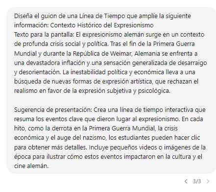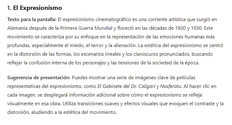 La IAG puede analizar rĆ”pidamente grandes cantidades de información y, con base en esto, generar contenido adaptado al tema de la presentación. Por ejemplo, si un docente estĆ” preparando una presentación sobre un tema complejo como la inteligencia artificial, la IAG puede sugerir definiciones clave, desglosar conceptos avanzados en explicaciones mĆ”s simples y proponer ejemplos relevantes. Esto es especialmente Ćŗtil en Ć”reas donde los docentes necesitan proporcionar una visión clara y comprensible de temas difĆciles. De esta manera, la IAG no solo reduce la carga de trabajo, sino que tambiĆ©n garantiza que el contenido sea preciso y relevante.