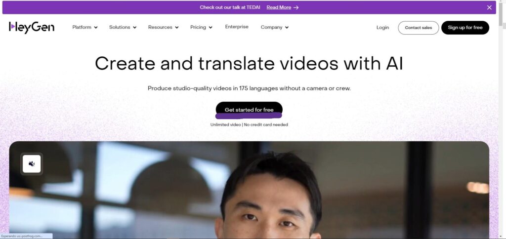 Paso 2.Seleccionar el boton de “Get started for free” (es decir Empieza sin costo”) para crear tu cuenta de HeyGen