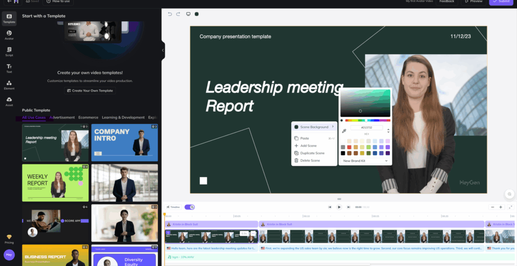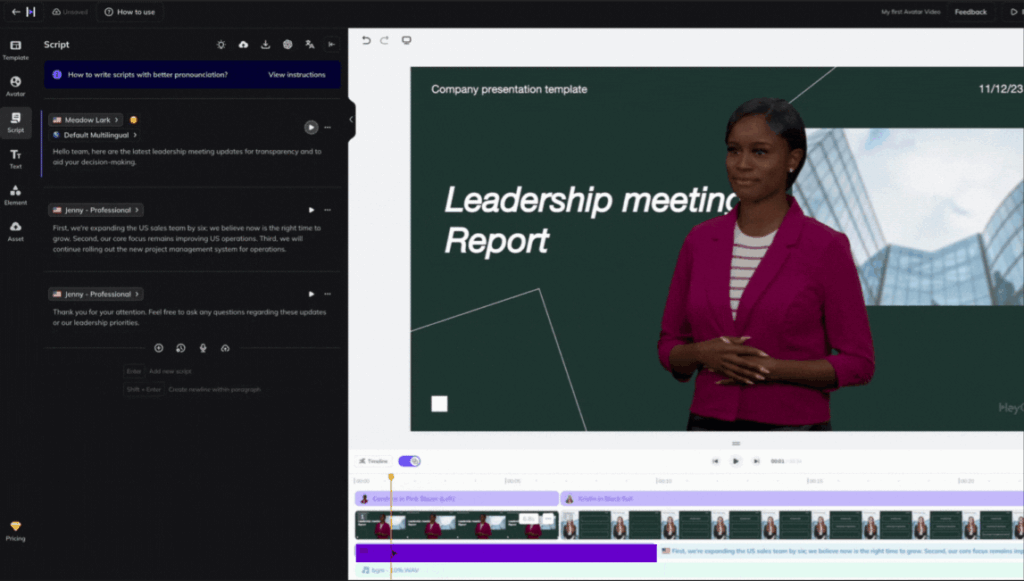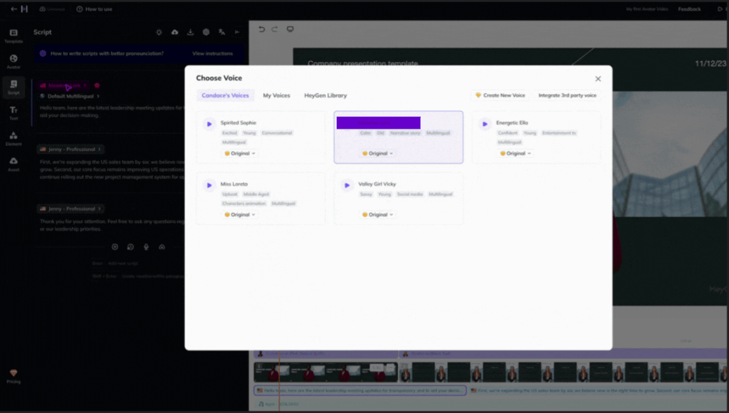 Paso 5. Para actualizar la voz del avatar en HeyGen dentro de la plantilla, primero debes ir a la lÃnea de tiempo donde se encuentra el guion. Una vez allÃ, haz clic en cada parte del guion que deseas modificar. Justo encima del cuadro de texto del guion, verás opciones para seleccionar una voz. Puedes elegir entre varias voces disponibles, lo que te permite personalizar cómo suena el avatar en cada sección del video. Este paso te da control total sobre el tono y estilo de la voz, para que coincida con el mensaje y el objetivo del video.