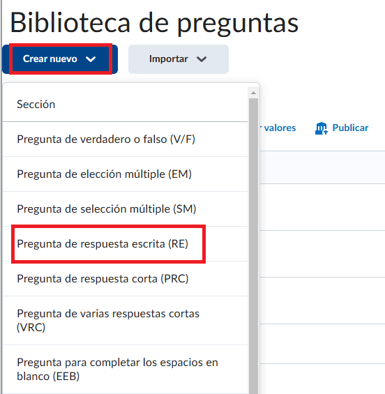 Ahora vamos realizar nuestras preguntas de respuesta escrita. Damos clic en Crear nuevo y Pregunta de respuesta escrita (RE)