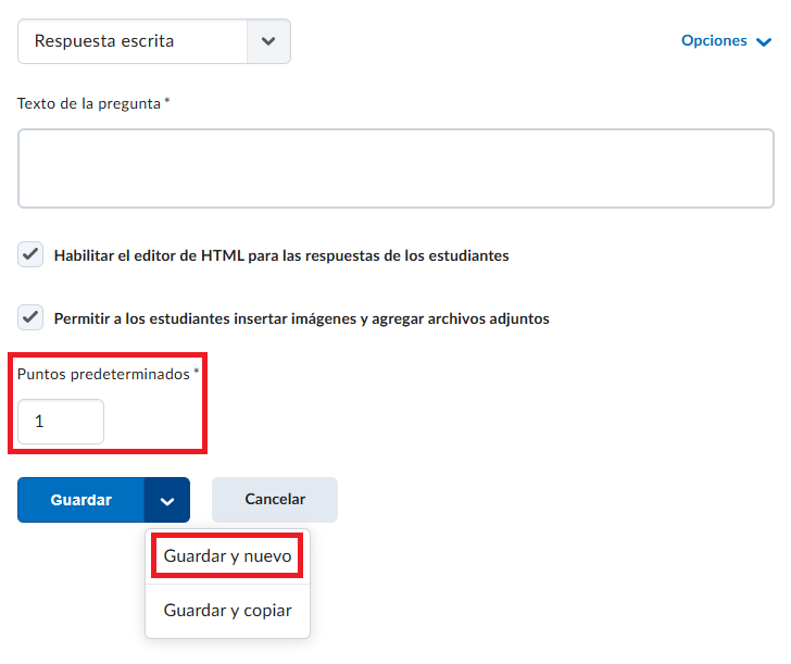 Y damos clic en Permitir a los estudiantes insertar imágenes y agregar archivos adjutos en caso de que necesitemos estas opciones.