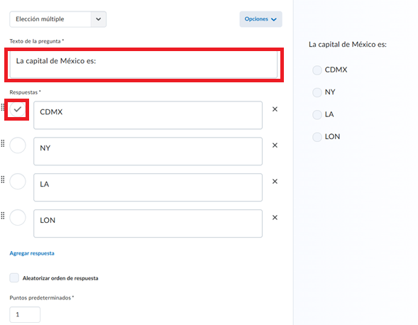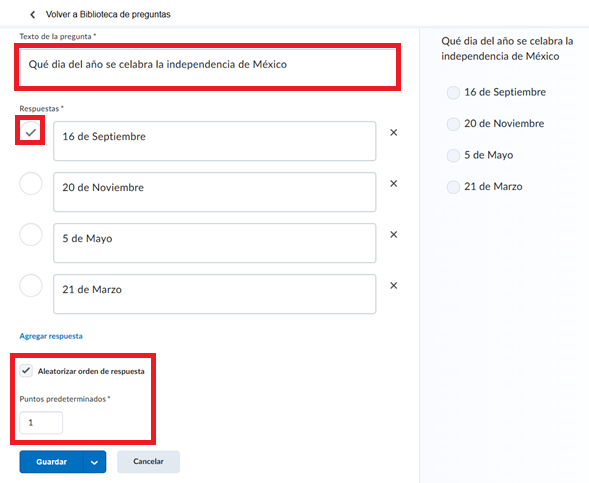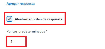 Seleccionamos la casilla Aleatorizar orden de respuesta, para que no importando que nuestra respuesta correcta siempre sea la primera, al alumno le aparecerán las opciones en orden aleatorio.