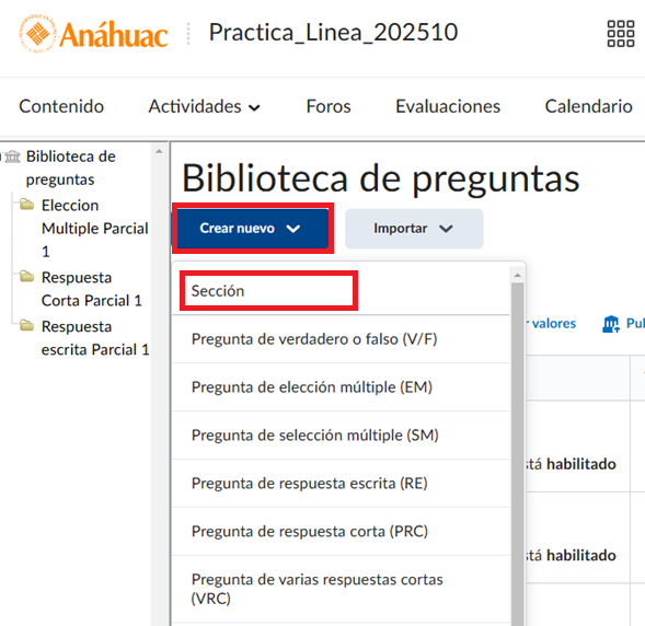 Debemos generar 1 sección más señalando el tipo de pregunta que vamos a crear. Esto es importante para poder generar nuestras evaluaciones de forma adecuada, ya que nos ayudará a seleccionar el tipo de preguntas adecuadas.