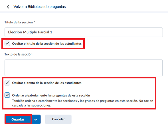 Seleccionaremos la casilla Ocultar el título de la sección de los estudiantes y seleccionamos las opciones Ocultar el texto de la sección de los estudiantes Ordenar aleatoriamente las preguntas de esta sección y daremos clic en Guarda