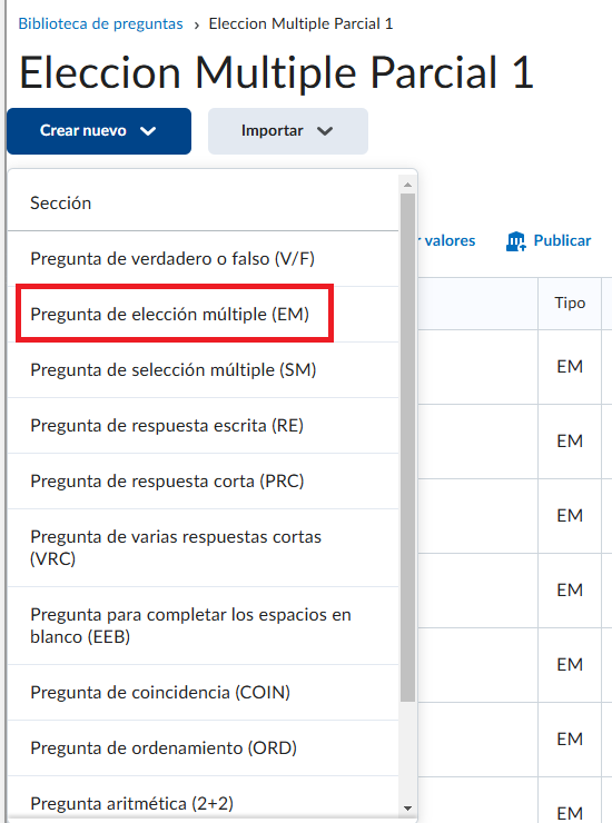 Ahora damos clic en Crear nuevo y seleccionamos Pregunta de elección Múltiple en las opciones.