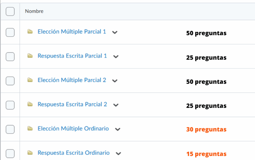 Al momento de crear la evaluación, en nuestros bancos de preguntas tendremos un total de 75 preguntas del primer parcial, 75 preguntas del segundo parcial y 45 preguntas correspondientes al ordinario.