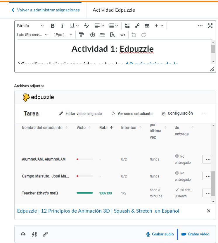 ✔️ Ve a “Editar actividad” y consulta las calificaciones en el recuadro adjunto de Edpuzzle.
