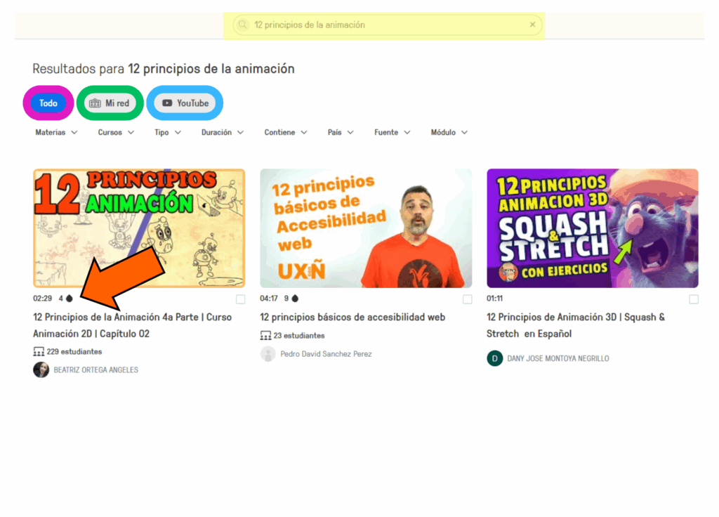 Si un video tiene un ícono en forma de gota (marcado con la flecha), significa que otro profesor ha agregado preguntas públicas que puedes reutilizar.