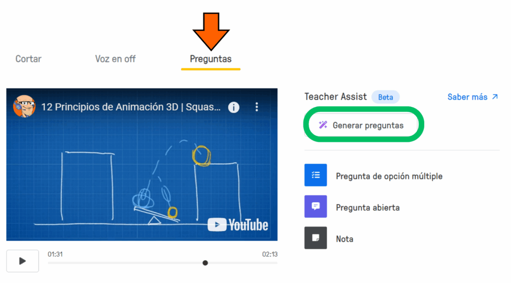 Además, puedes utilizar la opción de inteligencia artificial (marcada con un círculo verde) para generar automáticamente preguntas de opción múltiple en los puntos clave del video.