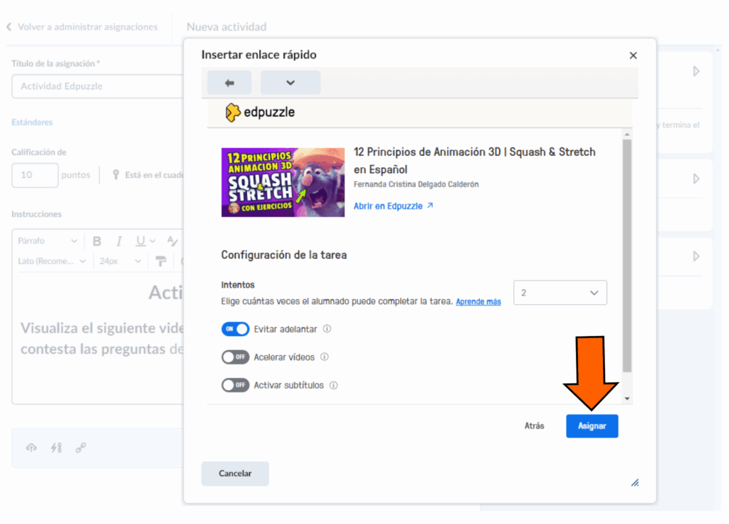 - Busca el video que deseas asignar y configura las opciones disponibles, como activar subtítulos o evitar que los alumnos adelanten el video.